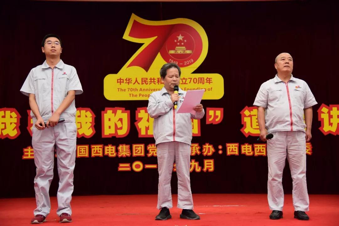 活動(dòng)中,展播了各單位《我和我的祖國(guó)》系列視頻,與會(huì)同志同唱了愛(ài)國(guó)歌曲《五星紅旗迎風(fēng)飄揚(yáng)》,聆聽(tīng)了詩(shī)歌朗誦《我的祖國(guó)》和西電故事《爭(zhēng)做頂梁柱,騰飛中國(guó)龍》,欣賞了展現(xiàn)工人力量的舞蹈表演《奮進(jìn)新時(shí)代》,三位“建國(guó)”同志結(jié)合個(gè)人成長(zhǎng)、企業(yè)變遷、祖國(guó)發(fā)展談了自己的切身感悟,西電西變、西開(kāi)有限兩家單位分別作了關(guān)于道德講堂的經(jīng)驗(yàn)交流,與會(huì)人員共同欣賞了歌伴舞《我和我的祖國(guó)》。現(xiàn)場(chǎng)活動(dòng)氣氛熱烈,大家情緒高昂,故事生動(dòng)感人,歌聲優(yōu)美嘹亮。