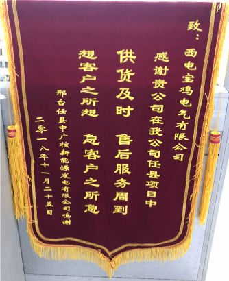 12月6日,西電寶雞電氣收到邢臺(tái)任縣中廣核新能源發(fā)電有限公司贈(zèng)送的錦旗,感謝公司優(yōu)質(zhì)履約邢臺(tái)任縣風(fēng)電場(chǎng)一期高低壓柜項(xiàng)目,贊譽(yù)西電寶雞電氣在該項(xiàng)目上“供貨及時(shí)、售后服務(wù)周到、想客戶(hù)之所想、急客戶(hù)之所急” 。