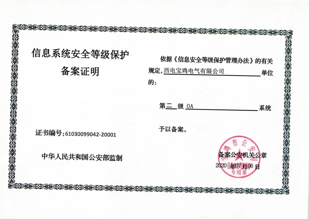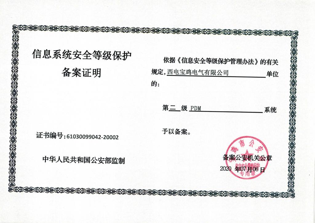 按照國家網(wǎng)絡安全相關規(guī)定和國家信息安全等級保護制度的要求,2020年3月開始,西電寶雞電氣啟動了網(wǎng)絡安全等級保護項目實施準備工作。經(jīng)過系統(tǒng)梳理自查、完善整改,6月9日-6月12日,由等級保護測評機構對公司OA和PDM信息系統(tǒng),分別從物理機房環(huán)境、網(wǎng)絡設備、服務器、應用系統(tǒng)、信息安全管理制度等方面,通過對服務器漏洞掃描、系統(tǒng)滲透測試等測評,最終得分符合二級等級保護備案標準要求,于2020年7月6日順利取得公安部門頒發(fā)的等級保護備案證書。