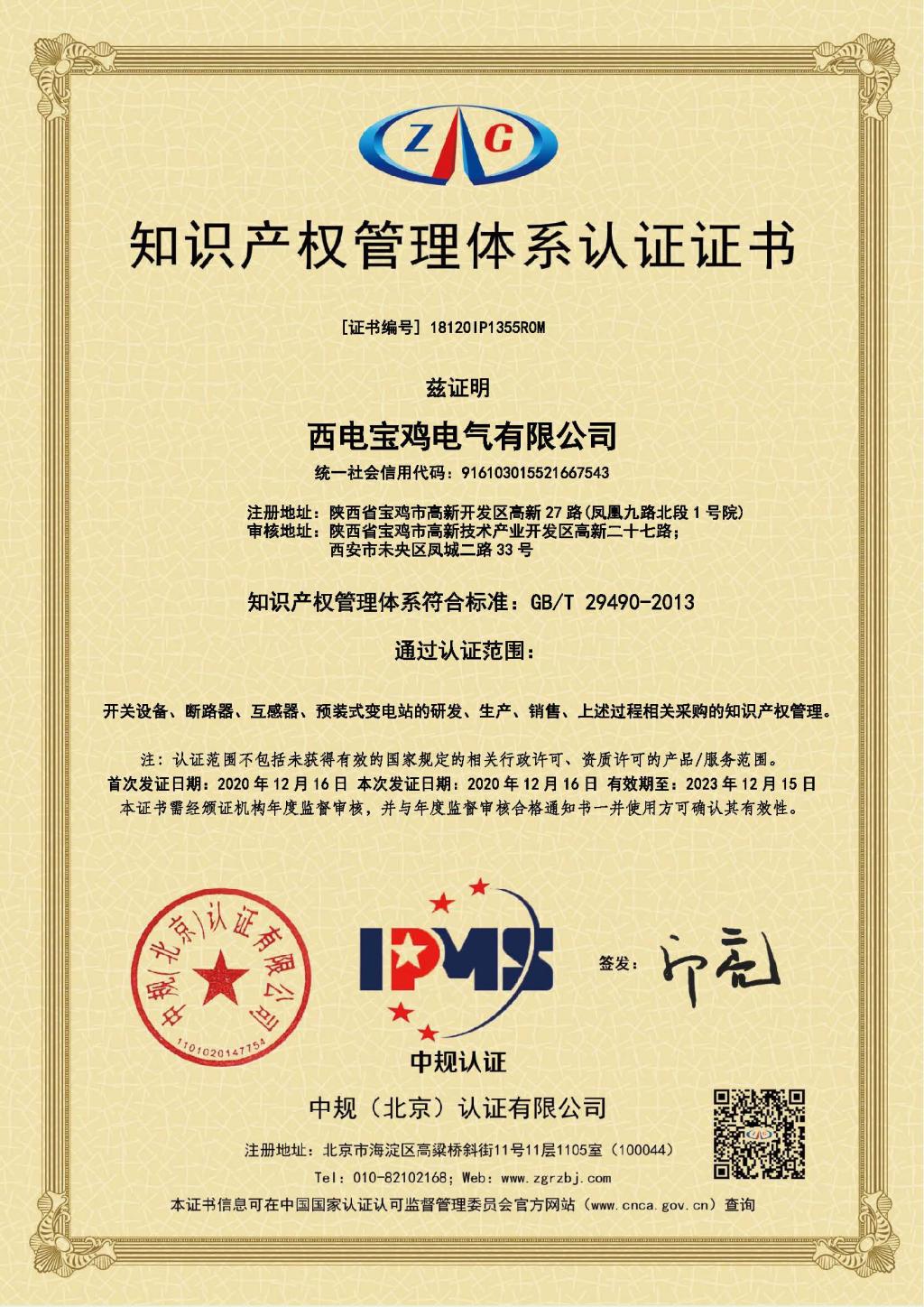 12月11日—12日,來自中知(北京)認(rèn)證有限公司的3位評審專家,對西電寶雞電氣《企業(yè)知識產(chǎn)權(quán)管理規(guī)范》(GB/T29490-2013)進行了貫標(biāo)審核。2020年12月16日,西電寶雞電氣正式取得知識產(chǎn)權(quán)管理體系認(rèn)證證書。