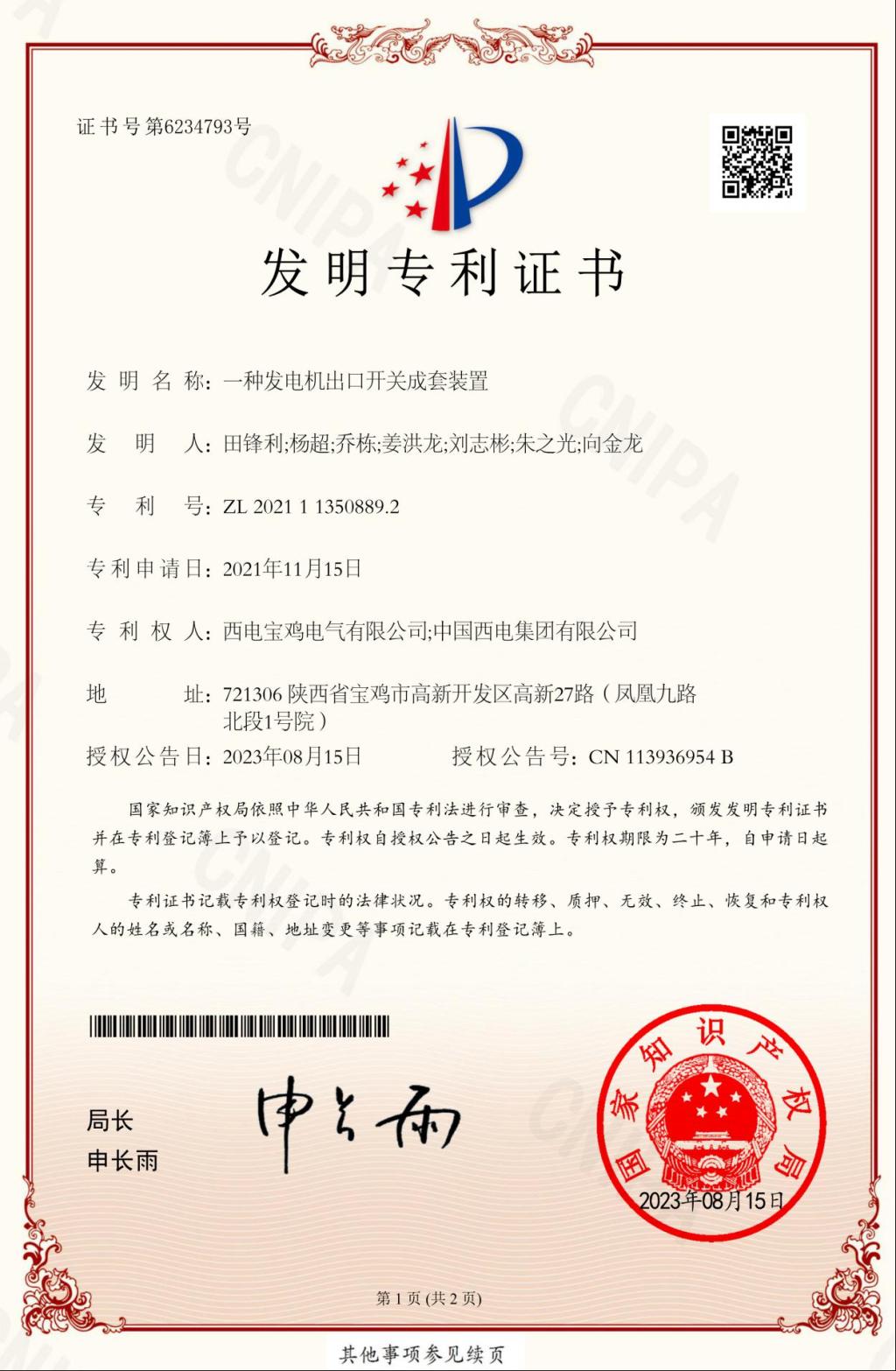 日前,由西電寶雞電氣自主研發(fā)的“一種發(fā)電機(jī)出口開關(guān)成套裝置”的發(fā)明專利,順利通過國家知識產(chǎn)權(quán)局審查,并獲得國家發(fā)明專利授權(quán),這是西電寶雞電氣完全自主研發(fā)獲得的首個專利,成為西電寶雞電氣科技創(chuàng)新能力發(fā)展的又一重要里程碑,標(biāo)志著向科技強(qiáng)企邁出扎實(shí)的一步。