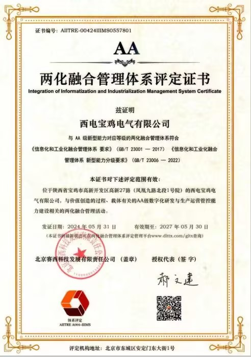 近日,西電寶雞電氣通過工業(yè)和信息化部《信息化和工業(yè)化融合管理體系要求》及《信息化和工業(yè)化融合管理體系新型能力分級要求》體系認證審核,取得兩化融合管理體系“AA”級認證證書,標志著西電寶雞電氣在推進“信息化”和“工業(yè)化”深度融合方面獲得國家最權威認可,彰顯了企業(yè)在兩化融合方面取得新的突破。