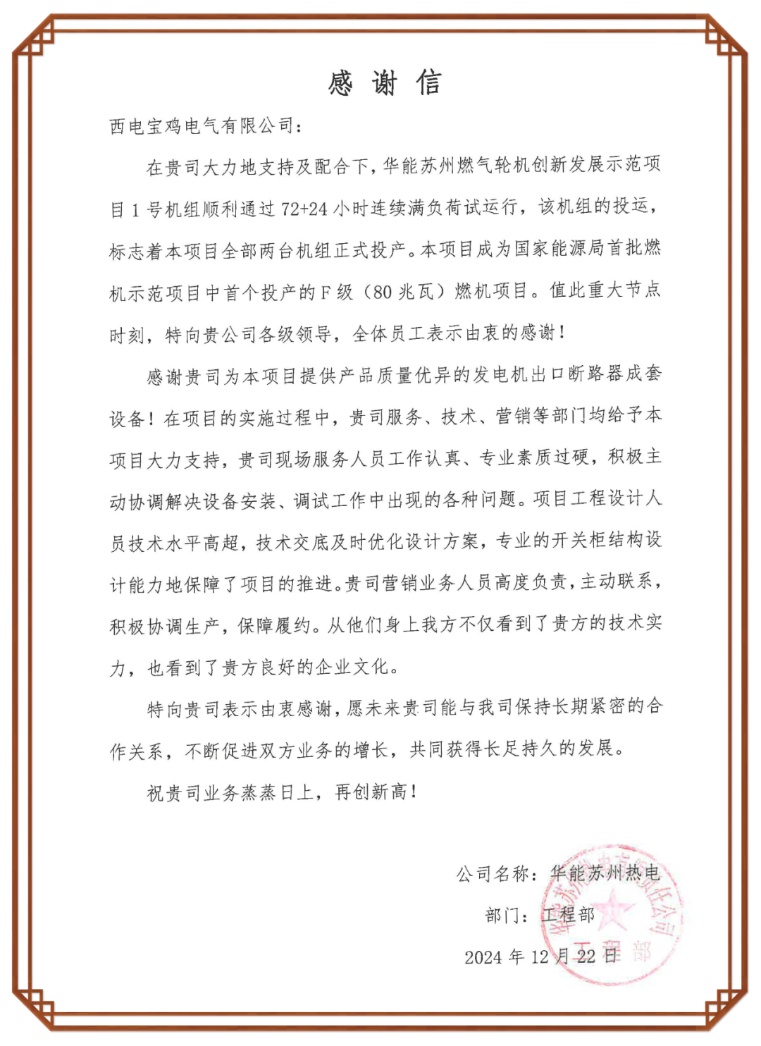 近日,華能蘇州燃?xì)廨啓C(jī)創(chuàng)新發(fā)展示范項(xiàng)目1號(hào)機(jī)組順利通過72+24小時(shí)連續(xù)滿負(fù)荷試運(yùn)行,標(biāo)志著該項(xiàng)目全部?jī)膳_(tái)機(jī)組正式投產(chǎn)。華能蘇州熱電有限責(zé)任公司發(fā)來感謝信,向西電寶雞電氣所有關(guān)心、支持蘇州燃?xì)廨啓C(jī)創(chuàng)新發(fā)展示范項(xiàng)目建設(shè)的領(lǐng)導(dǎo)和同仁致以由衷的感謝。